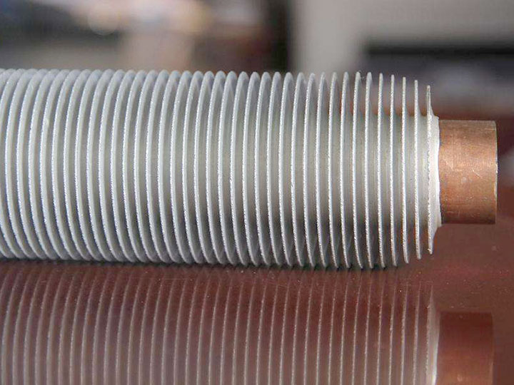 雙金屬復(fù)合翅片管是銅、鋁管(或鋼管、鋁管;或不銹鋼管、鋁管)經(jīng)復(fù)全后再軋制出翅片,具有結(jié)合緊密、熱阻小、傳熱性能好、強(qiáng)度高、流動(dòng)損失小、防腐蝕性能強(qiáng)、在長期冷熱工況下不晚變形、工作壽命長等優(yōu)點(diǎn)。