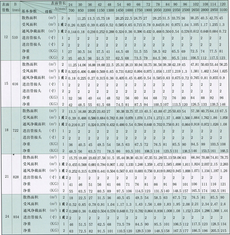 U型散熱排管有各種不同表面管長、管數(shù)、排數(shù)及翅片片距的多種配合,計有大小規(guī)格七百六十五種。